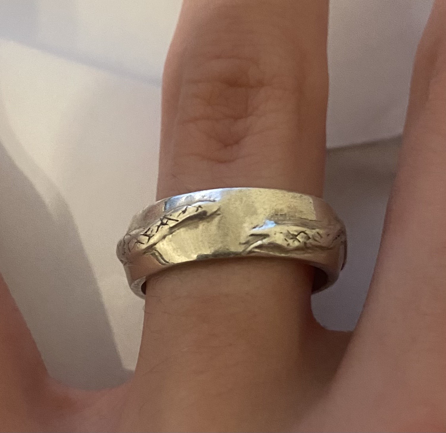 These are both rings I have learned to make during my co-op time. The first is a phases of the moon ring made using fabrication skills and the second is a snake that wraps around the finger that I carved from wax and then cast into metal. Both are made of sterling silver.