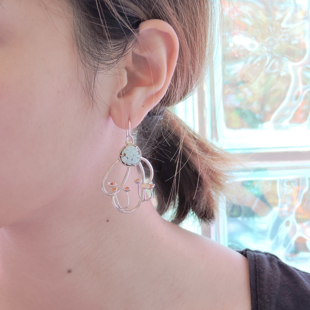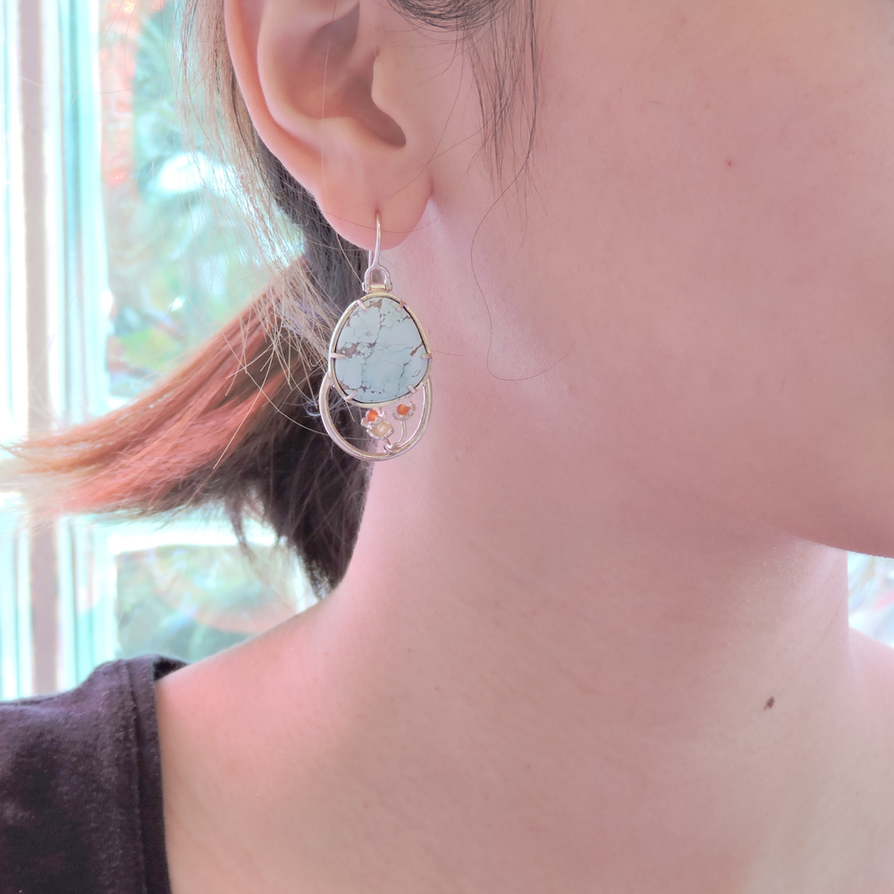 earring began with a pair of asymmetrical turquoise stones as the substrate for