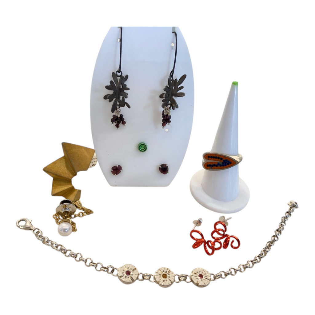 Here are some things to get you started! (From centre top) Earrings by Jamie Rosario (garnet dangling earrings and garnet studs), ring by Glaciale Goldsmith, earrings by Eunice Lin, bracelet by Frekkel Designs and brooch by Yuna Zhang.